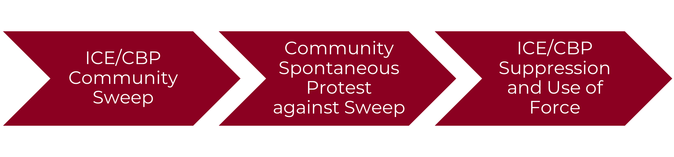 To be clear, surprise militarized raids by federal agents, protests against enforcement operations, and tear gas against protesters did not occur as separate, isolated phenomena. What emerged was a recurring, predictable dynamic of militarized immigration enforcement and escalation to use of force against protesters and bystanders.